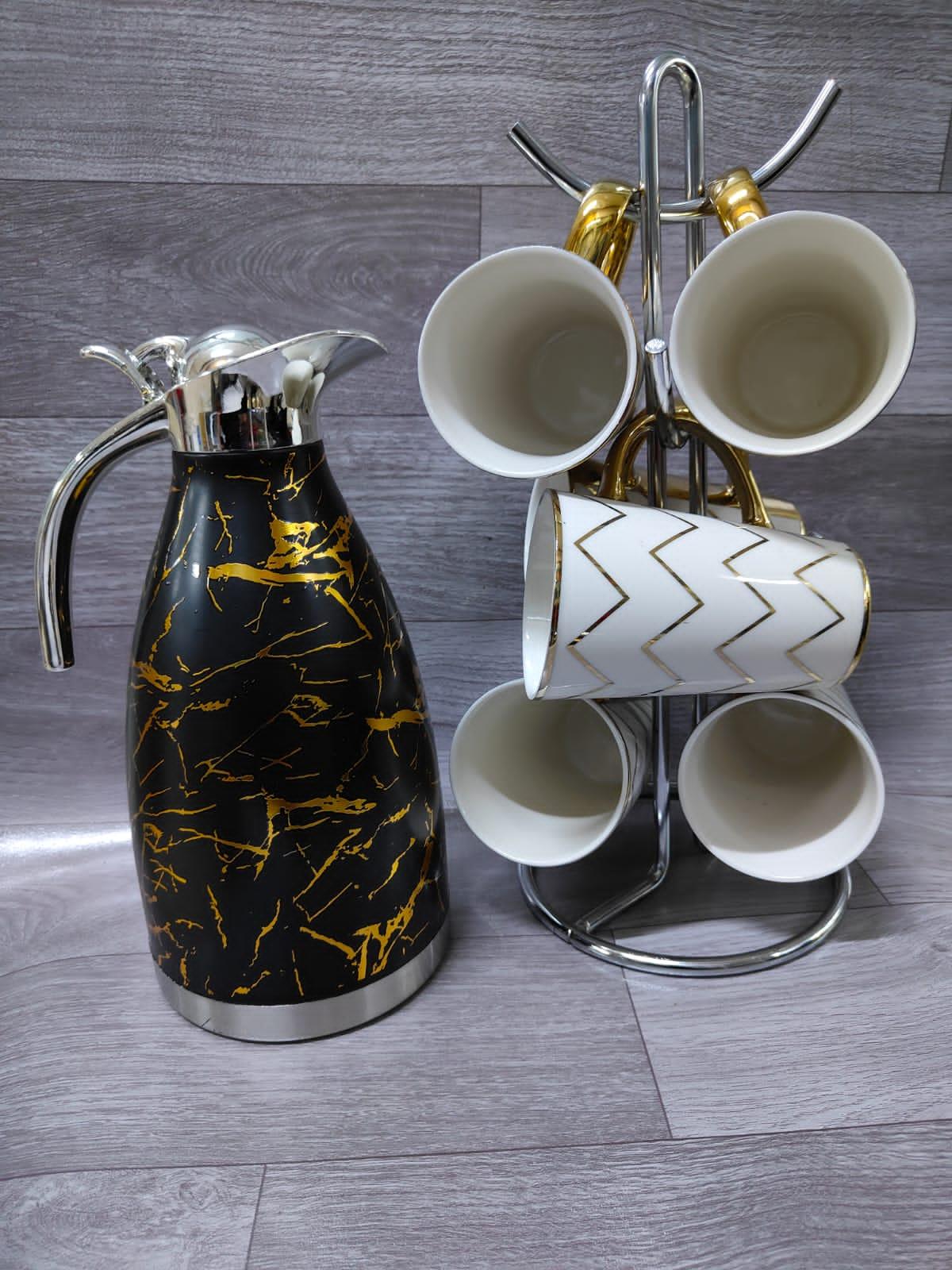 the above set Contains 1pc of 2ltr marble flask and 6pcs long mugs