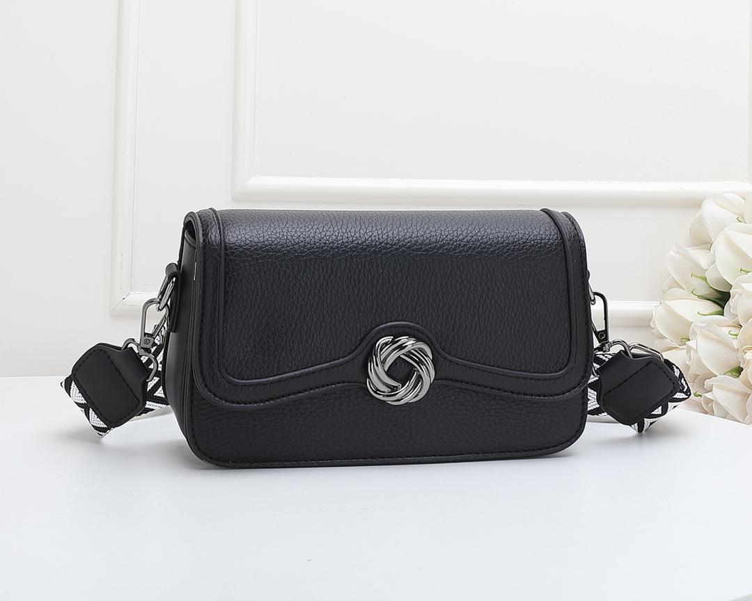 This chic leather crossbody bag features a unique circular metallic clasp and a trendy black and white patterned strap. Its compact design makes it ideal for carrying essentials while adding a touch of sophistication to your outfit.