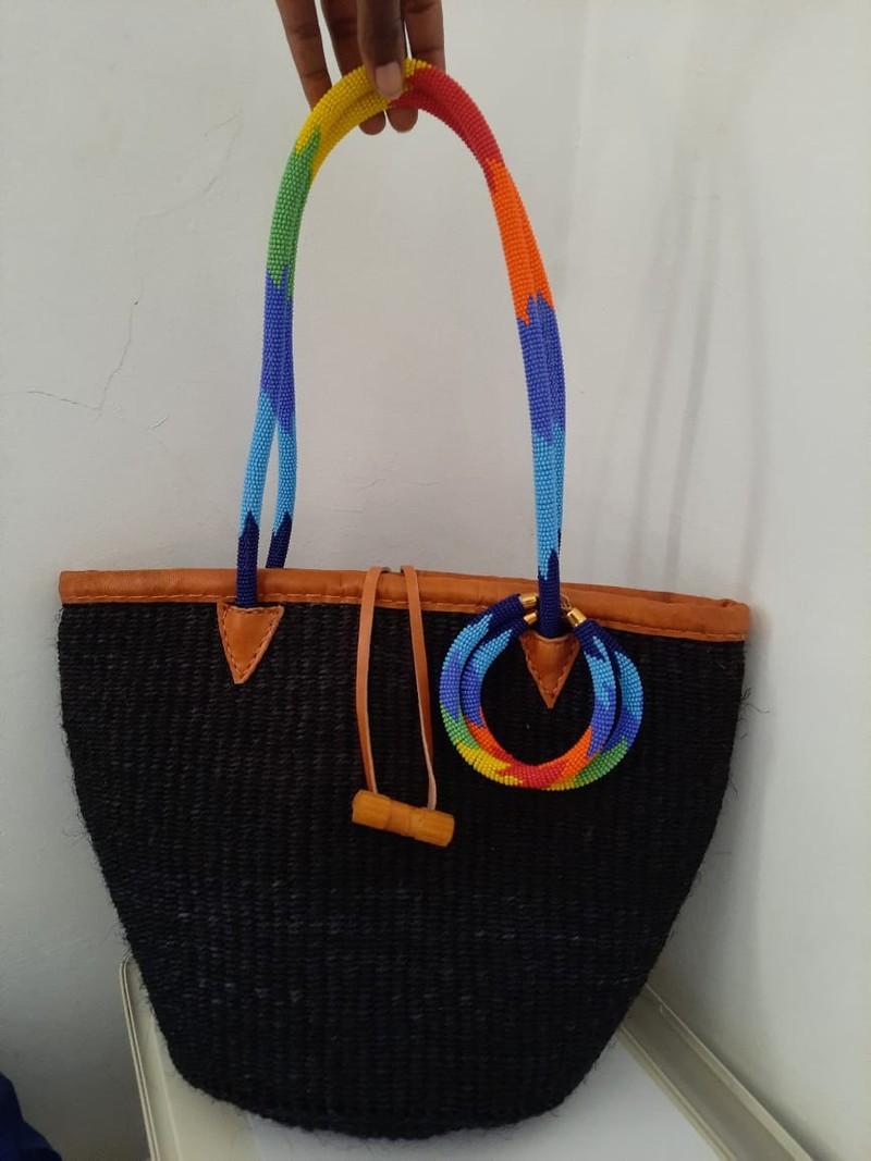 Sisal bag made from finest sisal dyed in black and its beauty enhanced with rainbow (upinde) beadwork on the handles. It is spacious, elegant and simply functional.