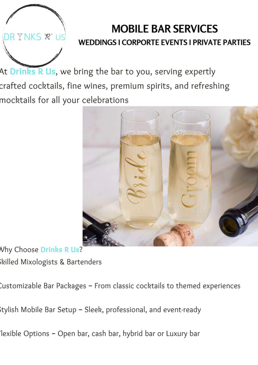 Cash Mobile bar for wedding after party includes Service Staff, Ice cubes, Garnishes, Disposable Cups, 6 hours of service