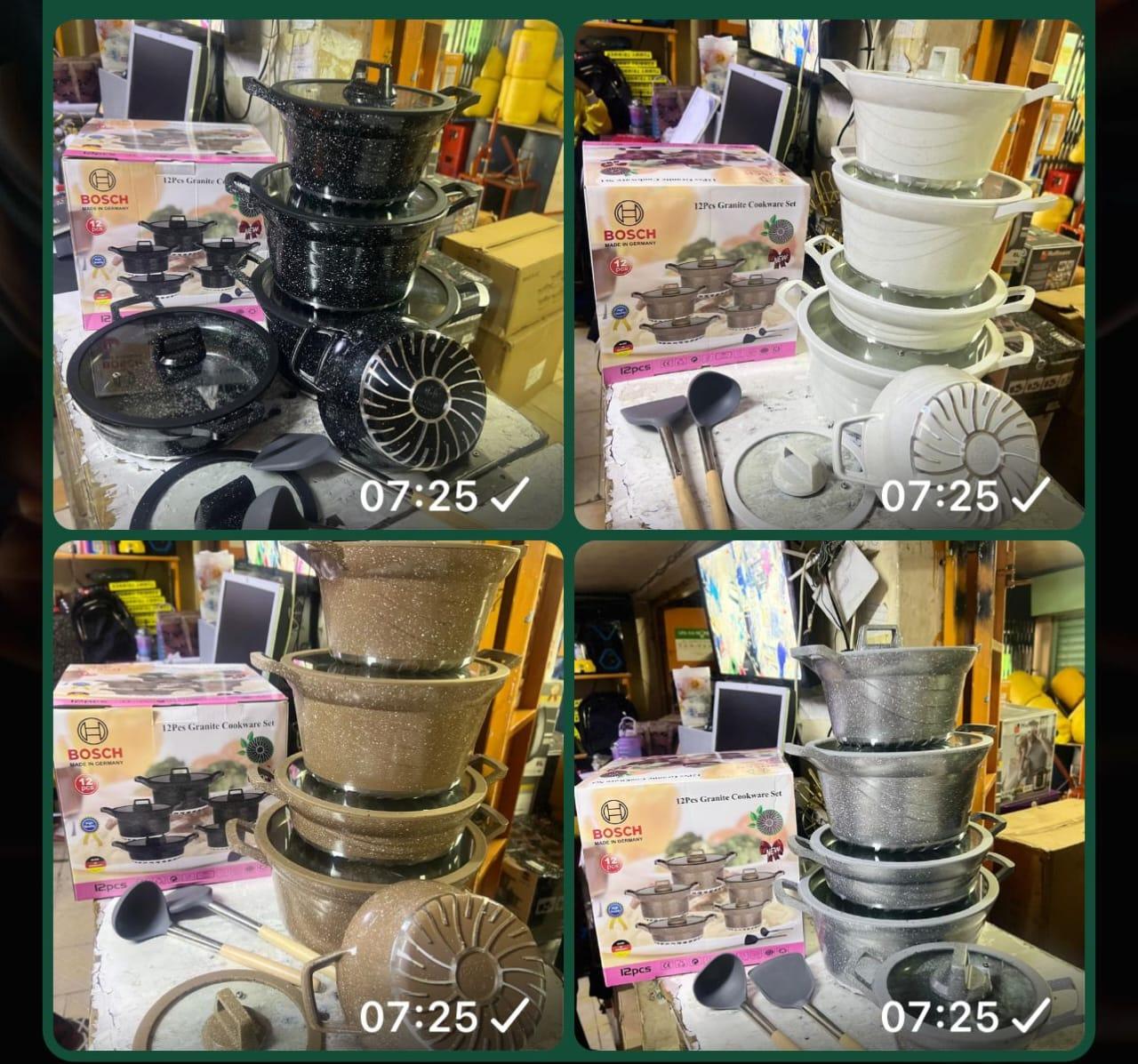 *12 pcs New bosch silicon regina made. In germany* Granite caoting size:32cm, 28 cm , pan 28 cm , 24cm and 20 cm. *New in Town Now available @🪄🆕@7700🔥🔥* colours: 🎯black. 🎯gray. 🎯white. 🎯brown🫶